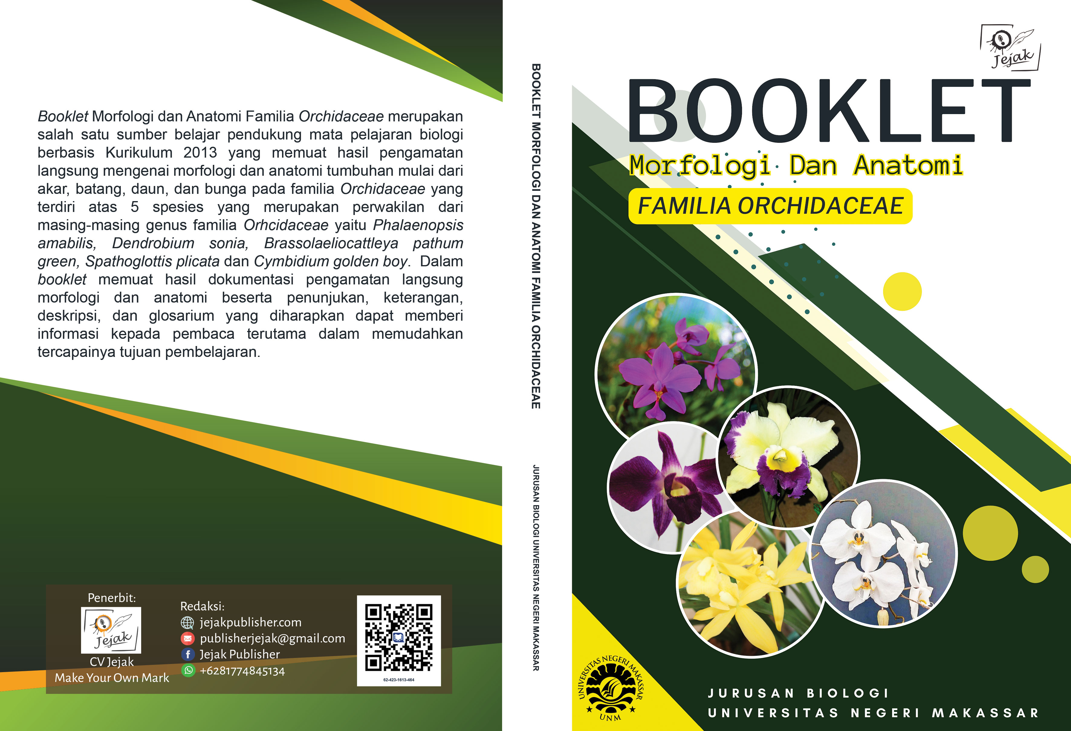 Booklet Morfologi dan Anatomi Familia Orchidaceae merupakan salah satu sumber belajar pendukung mata pelajaran biologi berbasis Kurikulum 2013 yang memuat hasil pengamatan langsung mengenai morfologi dan anatomi tumbuhan mulai dari akar, batang, daun, dan bunga pada familia Orchidaceae yang terdiri atas 5 spesies yang merupakan perwakilan dari masing-masing genus familia Orhcidaceae yaitu Phalaenopsis amabilis, Dendrobium sonia, Brassolaeliocattleya pathum green,Spathoglottis plicata dan Cymbidium golden boy. Dalam booklet memuat hasil dokumentasi pengamatan langsung morfologi dan anatomi beserta penunjukan, keterangan, deskripsi, dan glosarium yang diharapkan dapat memberi informasi kepada pembaca terutama dalam memudahkan tercapainya tujuan pembelajaran
