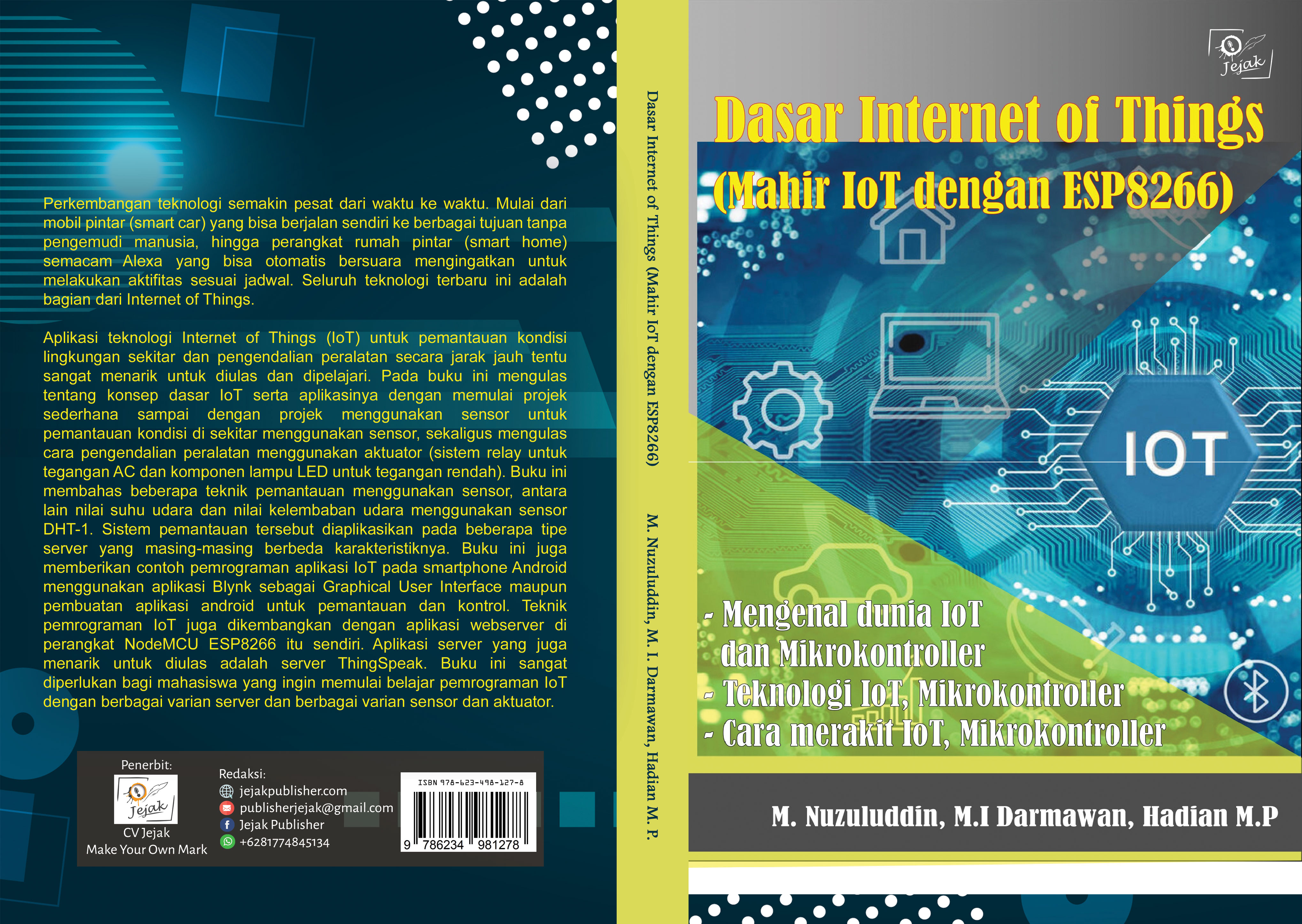 Aplikasi teknologi Internet of Things (IoT) untuk pemantauan kondisi lingkungan sekitar dan pengendalian peralatan secara jarak jauh tentu sangat menarik untuk diulas dan dipelajari. Pada buku ini mengulas tentang konsep dasar IoT serta aplikasinya dengan memulai projek sederhana sampai dengan projek menggunakan sensor untuk pemantauan kondisi di sekitar menggunakan sensor, sekaligus mengulas cara pengendalian peralatan menggunakan aktuator (sistem relay untuk tegangan AC dan komponen lampu LED untuk tegangan rendah). Buku ini membahas beberapa teknik pemantauan menggunakan sensor, antara lain nilai suhu udara dan nilai kelembaban udara menggunakan sensor DHT-1. Sistem pemantauan tersebut diaplikasikan pada beberapa tipe server yang masing-masing berbeda karakteristiknya. Buku ini juga memberikan contoh pemrograman aplikasi IoT pada smartphone Android menggunakan aplikasi Blynk sebagai Graphical User Interface maupun pembuatan aplikasi android untuk pemantauan dan kontrol. Teknik pemrograman IoT juga dikembangkan dengan aplikasi webserver di perangkat NodeMCU ESP8266 itu sendiri. Aplikasi server yang juga menarik untuk diulas adalah server ThingSpeak. Buku ini sangat diperlukan bagi mahasiswa yang ingin memulai belajar pemrograman IoT dengan berbagai varian server dan berbagai varian sensor dan aktuator.