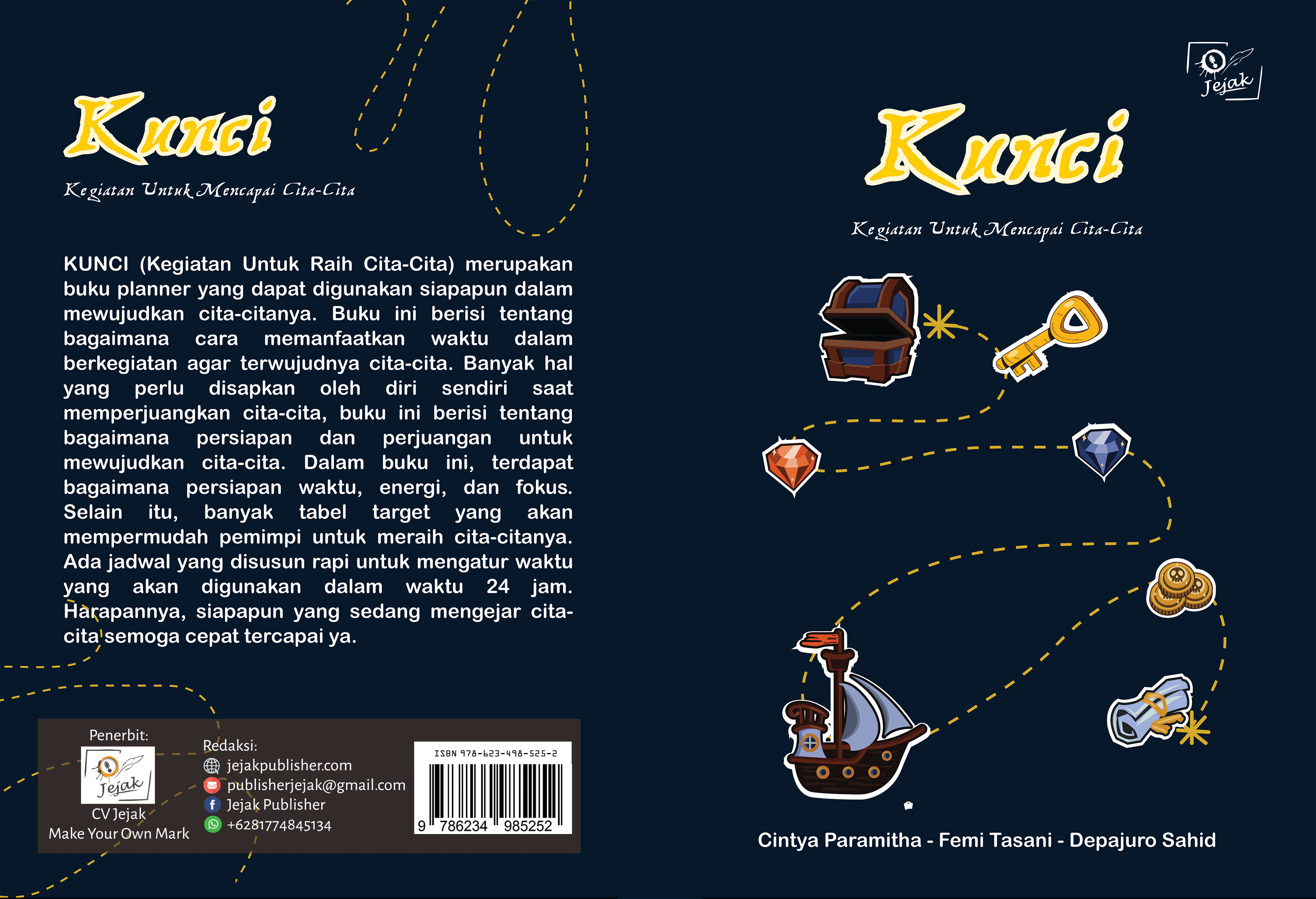 KUNCI (Kegiatan Untuk Raih Cita-Cita) merupakan buku planner yang dapat digunakan siapapun dalam mewujudkan cita-citanya. Buku ini berisi tentang bagaimana cara memanfaatkan waktu dalam berkegiatan agar terwujudnya cita-cita. Banyak hal yang perlu disiapkan oleh diri sendiri saat memperjuangkan cita-cita, buku ini berisi tentang bagaimana persiapan dan perjuangan untuk mewujudkan cita-cita. Dalam buku ini, terdapat bagaimana persiapan waktu, energi, dan fokus. Selain itu, banyak tabel target yang akan mempermudah pemimpi untuk meraih cita-citanya. Ada jadwal yang disusun rapi untuk mengatur waktu yang akan digunakan dalam waktu 24 jam. Harapannya, siapapun yang sedang mengejar cita-cita semoga tercapai ya.
