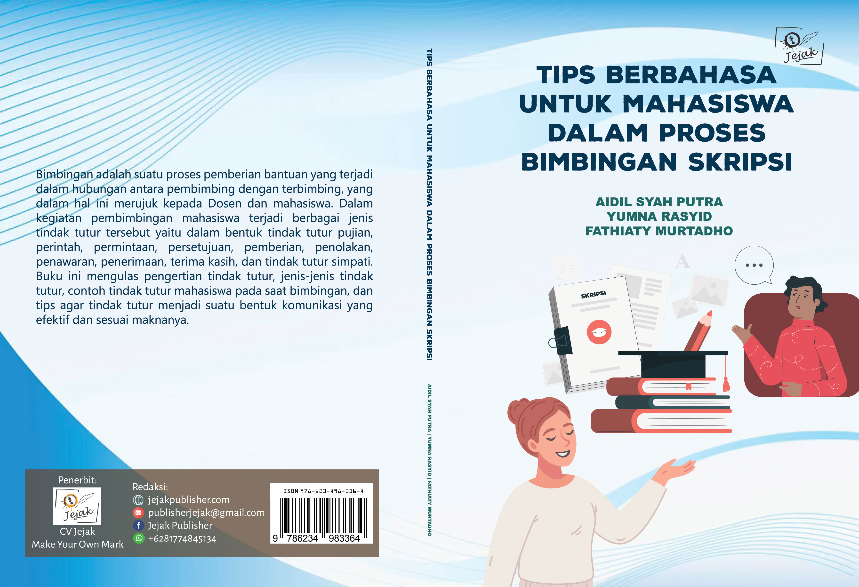 Bimbingan adalah suatu proses pemberian bantuan yang terjadi dalam hubungan antara pembimbing dengan terbimbing, yang dalam hal ini merujuk kepada Dosen dan mahasiswa. Dalam kegiatan pembimbingan mahasiswa terjadi berbagai jenis tindak tutur tersebut yaitu dalam bentuk tindak tutur pujian, perintah, permintaan, persetujuan, pemberian, penolakan, penawaran, penerimaan, terima kasih, dan tindak tutur simpati. Buku ini mengulas pengertian tindak tutur, jenis-jenis tindak tutur, contoh tindak tutur mahasiswa pada saat bimbingan, dan tips agar tindak tutur menjadi suatu bentuk komunikasi yang efektif dan sesuai maknanya.